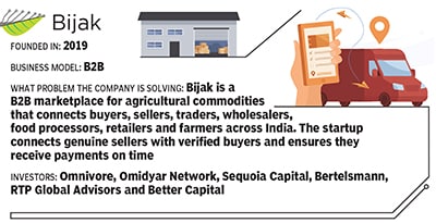Within six months of inception, in September 2019, Bijak managed to raise seed funding of $2.5 million from Omnivore, Omidyar Network and Sequoia Capital India. The company has managed to raise a total of $35 million—the latest round was in January, in which the company raised $20 million in a Series B funding round led by Bertelsmann with other existing investors participating. Bijak’s current valuation stands at $180 million. The startup says their platform oversees trade in over 100 commodities every day and now sees an annualised gross merchandise value of Rs 3,500 crore.