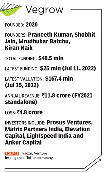Vegrow is a B2B marketplace for fruits, backed by investors including Prosus Ventures, Matrix Partners India, Elevation Capital, Lightspeed India and Ankur Capital. The company aggregates demand and supply, including wholesalers, semi-wholesalers, as well as channels called modern trade and general trade in 100 cities and from more than 20,000 farmers, Vegrow said in July, when it announced a $25 million funding round. It was valued at more than $167 million at the time, according to data from Tracxn.