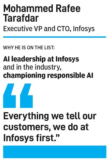 Rafee Tarafdar has spent more than 20 years at Infosys, where he is an executive VP and CTO. Tarafdar has emerged as the point person for Infosys’s transformation into an ‘AI-first’ organisation. He’s also widely recognised as an authoritative technology strategist in the tech services and consulting space, where Infosys, India’s second biggest provider, serves enterprise customers from America to Australia.