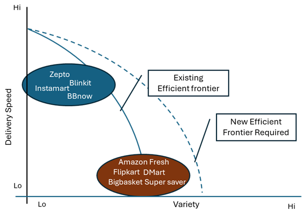 Over the years, supply chain management wisdom has recommended that firms choose between high delivery speed and high variety to offer an appropriate cost to serve that the consumer is willing to pay. The trade-off is known as the efficient frontier (Figure 1). For example, supermarkets such as DMart keep 25,000+ SKUs near customer locations and promise a delivery time of 2-6 hours.