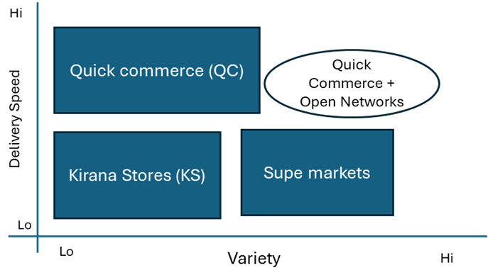 The answer may also lie in a clever adaptation of the QC platform to Open Networks such as Beckn-operated ONDC. Open Networks allow sellers (brands or their distributors) and buyer apps such as QC platforms (who aggregate demand/consumers) to exist as independent entities on the network, i.e. sellers need not necessarily be on the QC platform. This allows any customer on a buyer app (e.g. QC platform) to have access to products from all sellers on the network. Open Networks thus enable the discoverability of a large variety of items.