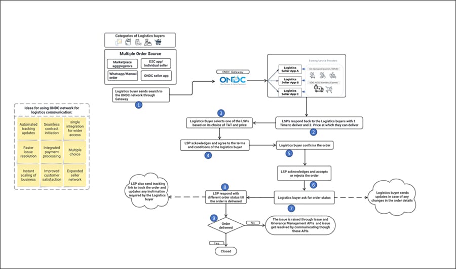 The innovation allows small retailers to quickly discover all available logistics capacities with just a click through an aggregator onboarded as a logistics buyer service provider on ONDC. ONDC network enables small businesses to focus on their core competencies. For example, a D2C brand can dedicate its efforts to building and managing its brand without worrying about logistics, accelerating business growth and scalability. Similarly, small logistics providers with limited fleet sizes can list their capacity through a technology or a logistics service provider"s (seller) application on ONDC. This opens up a previously inaccessible market, making their services discoverable and reducing idle time for their fleets.