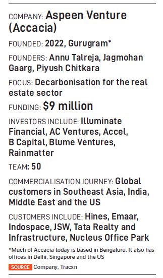 Among Accacia’s top customers is US-based Hines, one of world’s top 10 real estate owners, Talreja says. Other well-known businesses using the startup’s products include Nucleus Office Parks, the India operator of the real estate owned by Blackstone, the world’s biggest money manager, and Tata Realty and Infrastructure Limited.