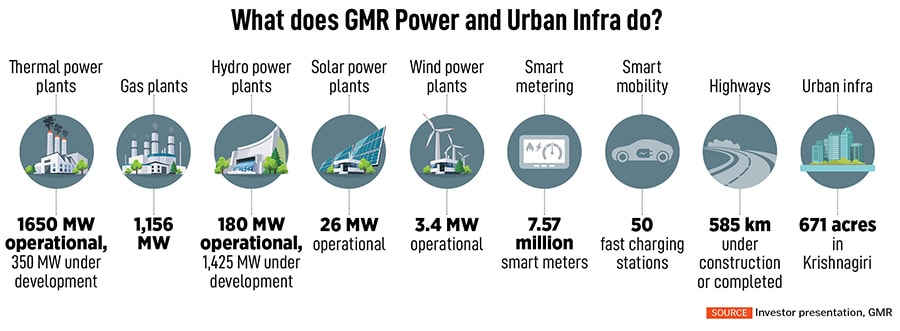 GMR Power and Infra, the arm that looks after energy, urban infrastructure and transportation, currently has two thermal plants, a 1,650 MW operational plant and a 350 MW under-construction plant. There are also gas plants, hydropower plants, solar power plants and wind plants that the company is currently operating or developing alongside road infrastructure projects. GMR is also setting up 50 EV (electric vehicles) charging facilities in addition to a 2,101-acre multi-product Special Investment Region (SIR) at the industrial hub of Krishnagiri in Tamil Nadu.