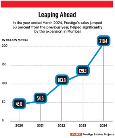 Indeed, the numbers speak for themselves. In the fiscal ended March 2024, Prestige notched up record sales of ₹210 billion ($2.6 billion) with Mumbai accounting for 15 percent, up from nearly 7 percent two years earlier when annual sales were just under half that at ₹103 billion. In the current fiscal, Razack expects a 54 percent surge in Mumbai sales to ₹50 billion, even as he’s plotting Prestige’s expansion into other cities beyond its southern stronghold, which includes a sizeable presence in Hyderabad.