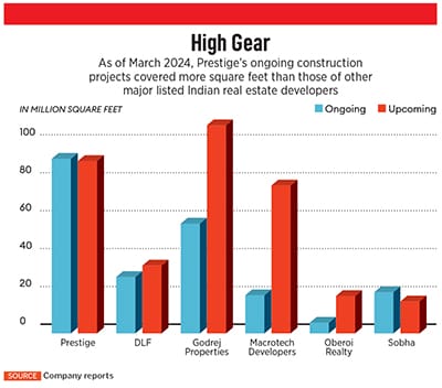 With 300 completed projects under his belt, Razack believes that he’s poised for the biggest leap in his career with a $7.2 billion project pipeline. Prestige has 92 million square feet in ongoing projects, the most among listed peers. And it has 91 million square feet in planned projects for which approvals are pending, the second-largest among listed peers. Says Razack: “We’re pouring 65 million tonnes of concrete across different projects."