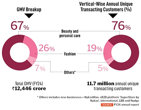 The beauty vertical consists of the beauty ecommerce platform, physical retail stores, owned brands as well as the eB2B business called Superstore—all of which are scaling fast. The beauty business for Nykaa has been its core revenue driver, accounting for 73 percent of the consolidated GMV (gross merchandise value)—which is at ₹12,400 crore in FY24, a 28 percent year over year increase.