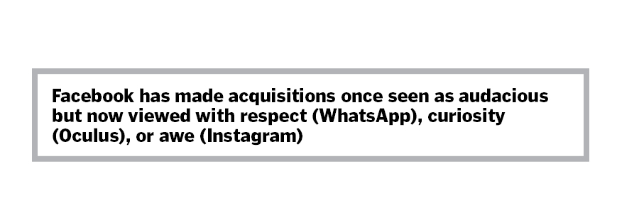 That has no doubt helped Facebook make several acquisitions once seen as audacious but now viewed with respect (WhatsApp), curiosity (Oculus) or awe (Instagram, one of the best corporate purchases this century).
