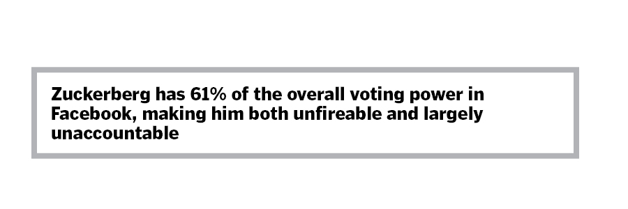Currently, he owns 99 percent of the supervoting Class B shares and has 61 percent of the overall voting power, making him both unfireable—and largely unaccountable. “Can you gather all the other common shareholders to vote against Mark?" asks his friend and Facebook co-founder Dustin Moskovitz. “No, you can’t."