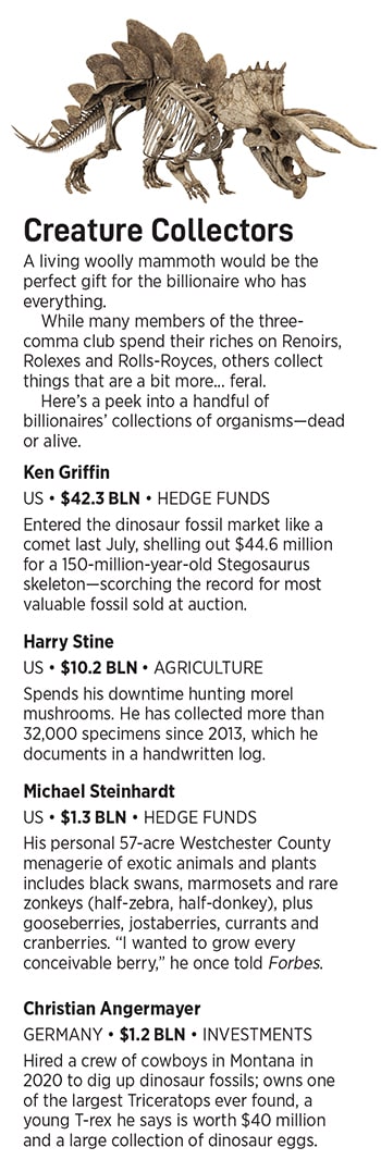 In January, Colossal closed a $200 million fundraise at a $10.2 billion valuation. That brings its total raised to $435 million from bluechip investors including Breyer Capital, Draper Associates and TWG Global. While Colossal does not yet have revenue, it has already spun out two additional startups: Computational biology platform Form Bio (in 2022) and biological recycling company Breaking (2024). The most recent round makes Lamm, who is CEO, worth an estimated $3.7 billion. Church, 70, does not have an equity stake in Colossal. “The fact that I’m not a billionaire is almost as interesting as Ben being one," says Church, adding, “If I had a billion dollars, I would just spend it on this." For Church, who is best known for developing the first genomic sequencing method in 1984 but who also has co-founded some 50 biotech companies, the woolly mouse is a proof of concept that has been a long time coming. He’s been working on sequencing the mammoth’s genome for nearly two decades, though his obsession started far earlier. “Like most kids I had an affection for big furry things," he says. “I was part of the generation that read Jurassic Park." The work started with digging up the remains of woolly mammoths from the Arctic permafrost. Church and his researchers then compared their DNA with that of a close living relative, the Asian elephant, with the goal of bringing a mammoth-elephant hybrid to life. They’re hoping for a calf by 2028. The woolly mice were created to help Colossal’s scientists test the connections between certain DNA sequences and specific mammoth traits like size, shaggy fur and an accelerated metabolism good for very cold climates.