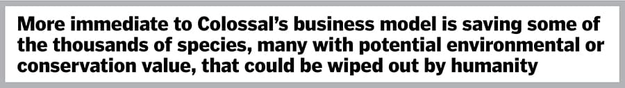Colossal was started in 2021 by serial entrepreneur Ben Lamm, a 43-year-old Texan who has dabbled in a variety of industries including video games and e-learning, and the legendary Harvard geneticist George Church. The company describes itself as being in the “de-extinction" business. That means using ancient DNA and Crispr gene editing techniques to try to bring back extinct fauna like the woolly mammoth, the dodo and the Tasmanian tiger. But those efforts are mostly about exciting investors and grabbing headlines.