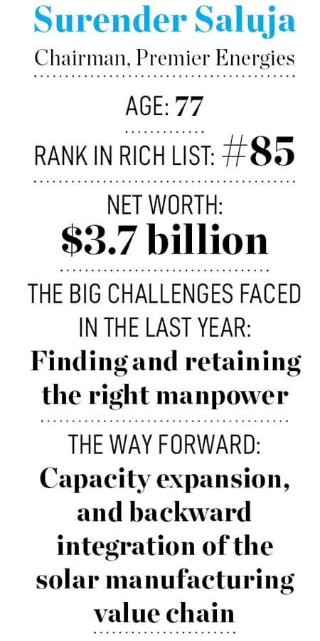 Saluja set up Premier Energies in Hyderabad in 1995, at a time when not many people knew about the potential of solar energy. He remembers how they would take a DC bulb and connect it to a solar plate using two wires to show how it could produce power. The company started with basic products like solar lanterns and streetlights, and executed projects that involved installing solar installations in remote villages that did not have access to electricity. In 1999, they commenced solar module manufacturing.