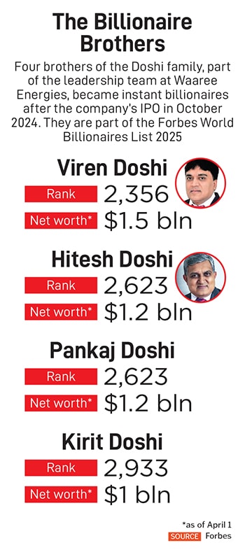 Doshi turned billionaire in October 2024 along with three of his brothers (see box) when his company Waaree Energies listed on the Indian bourses at a 70 percent premium to its initial public offering (IPO) issue price of Rs 1,503. Waaree Energies raised Rs 3,600 crore by issuance of primary shares during its IPO.