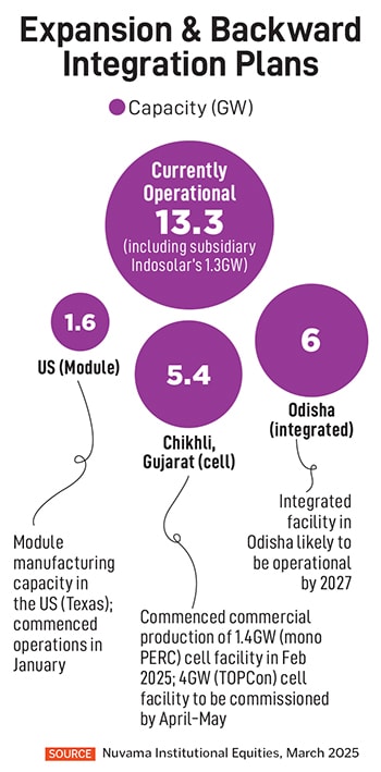 Apart from the 5.4 GW cell manufacturing that is expected to be operational this fiscal (see box), Waaree Energies has won a production-linked incentive (PLI) project for setting up a 6 GW integrated facility to manufacture wafers, ingots, cells and modules, which will help with its backward integration ambitions.