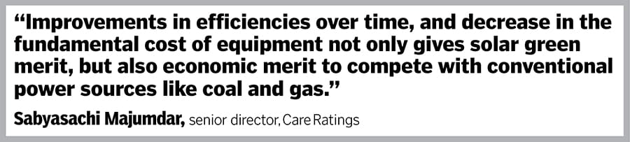 “Investments into solar initially started as a push towards clean energy, but improvements in efficiencies over time, and decrease in the fundamental cost of equipment not only gives it green merit, but also economic merit to compete with conventional sources of power like coal and gas," says Sabyasachi Majumdar, senior director, Care Ratings.