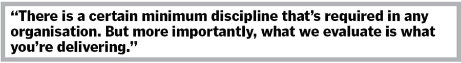 To me, it’s not necessarily about how many hours you’re at your desk. It’s about the kind of output you give. It’s not about optics, it’s about delivery. I’m a great believer in where you need to work and when you need to work. If you need to work long hours, you do that. When you can afford to take it slightly easier for a couple of days, you do that. We have a policy where we say that you can’t come to work at 12 o’clock and leave at 4 o’clock. At the same time, you don’t need to come at 8 [in the morning] and leave at 8 [at night]. There is a certain minimum discipline that’s required in any organisation. But more importantly, what we evaluate is what you’re delivering. Are you delivering your key result areas? Are you excelling or failing? Those are far more important.
