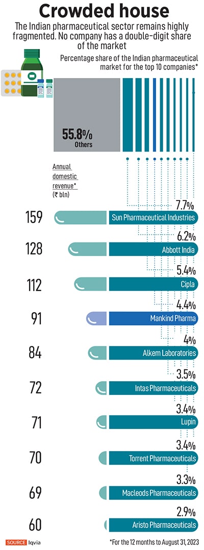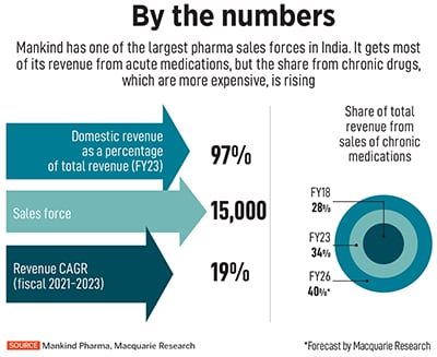 Analyst Shah says moving into the top three “is not an impossible goal". But Mankind faces challenges. If it wants to become bigger, faster, it needs to make a big push on acquisitions, she says, and watch out for any regulatory disruptions. In August, the government proposed that doctors prescribe only unbranded generics. These so-called trade generics are cheaper than their branded counterparts and could undermine profits at companies such as Mankind. However, the proposal has since been suspended. Only 2 percent of Mankind’s fiscal 2023 revenue came from trade generics, according to Shah. Another potential snag is price controls: The government caps the cost of certain medications it deems essential. As of December 31, 2022, some 17 percent of Mankind’s drugs were on the list, which is periodically revised.