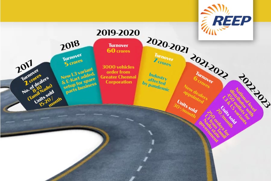 In 2017, Powergear diversified into another unit called Powergear Sustainability and operates through Reep Motors (a brand in its aegis). REEP Motors is primarily focused on the electric vehicle (EV) business. Based out of Chennai, Reep Motors started off with market research initially and now manufactures EVs. REEP Motors first forayed into three wheelers. It has now developed over 12 different models. First among its product launches include a three-wheeler variant which is designed to carry a payload of 500 kgs (whereas a typical L3 variant is required to carry up to 300 kgs), while its L5 variant is designed to haul up to one tonne (whereas a typical L5 variant takes up to 640 kgs). The unique designs of these two variants are generating large order book year on year. For ex: in the year 2019, REEP secured a large order of about 3000 units solid waste disposal from its esteemed customers and till date all vehicles are running successfully.