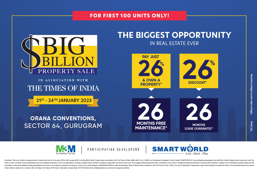 The four-day Big Billion Dollar Property Sale in association with Times of India and strategic partner Anarock is one of its kind exhibitions that has M3M-a company which has transformed the skyline of Delhi NCR and Smartworld- a company that created headlines in its debut year offering a wide spectrum of real estate asset classes from plotted development, SCOs, offices, retail, residences and more! The four-day-sale from 21st to 24th January is touted to be the biggest opportunity of real estate.
