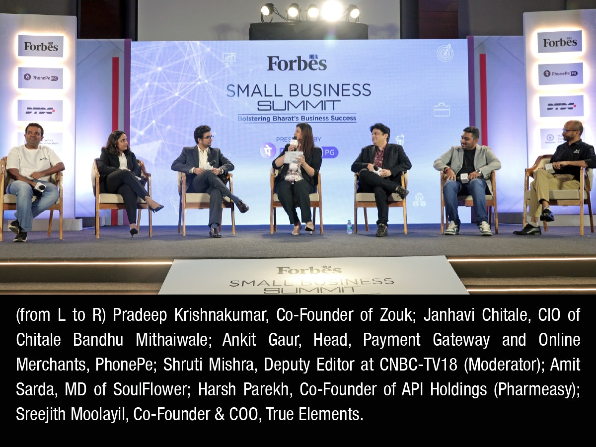 Up next was a panel discussion titled "Small, Smart, Sustainable: How Maharashtra’s MSMEs Can Pioneer a Digital Future", which featured esteemed entrepreneurial talent - Amit Sarda, MD of SoulFlower Harsh Parekh, Co-Founder of API Holdings (Pharmeasy) Sreejith Moolayil, Co-Founder & COO of True Elements Pradeep Krishnakumar, Co-Founder of Zouk Janhavi Chitale, CIO of Chitale Bandhu Mithaiwale and Ankit Gaur, Head, Payment Gateway and Online Merchants, PhonePe.