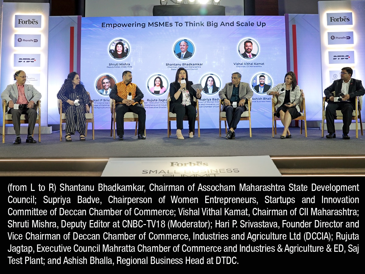 The first panel discussion of the Forbes India Small Business Summit in Pune, "Empowering MSMEs to Think Big and Scale Up", featured a diverse line-up of industry leaders - Shruti Mishra, Deputy Editor at CNBC-TV18 (Moderator) Shantanu Bhadkamkar, Chairman of Assocham Maharashtra State Development Council Vishal Vithal Kamat, Chairman of CII Maharashtra Hari P. Srivastava, Founder Director and Vice Chairman of Deccan Chamber of Commerce, Industries and Agriculture Ltd (DCCIA) Rujuta Jagtap, Executive Council Mahratta Chamber of Commerce and Industries & Agriculture & ED, Saj Test Plant Supriya Badve, Chairperson of Women Entrepreneurs, Startups and Innovation Committee of Deccan Chamber of Commerce and Ashish Bhalla, Regional Business Head at DTDC.