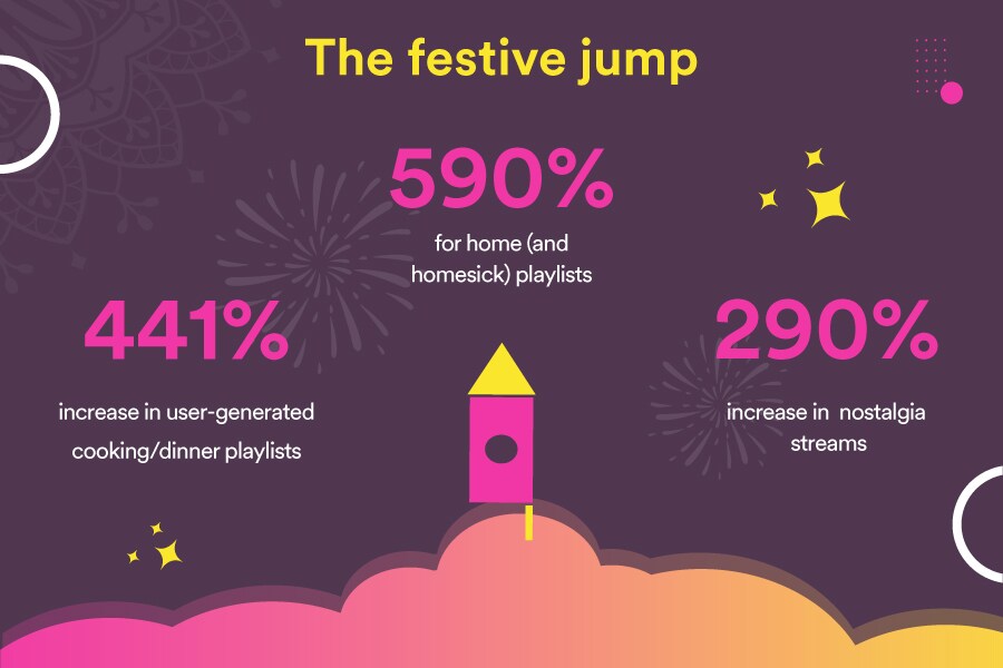 Listeners are in the mood for memories as much as living in the moment with activities such as festive cooking. A massive 441% increase in user-generated cooking/dinner playlists bears this out while a growth of 290% for nostalgia streams and 590% for home (and homesick) playlists show that listeners are turning to music to connect with memories of good times past. This provides a unique opportunity for brands to tune in to consumers and engage with them in more ways than one.