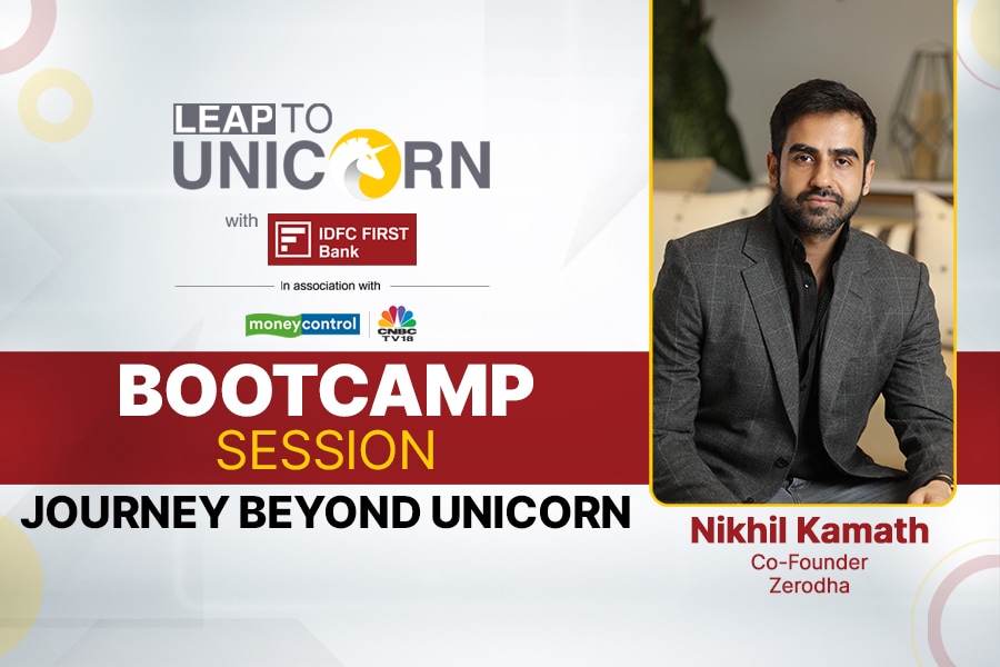 The bootcamp sessions, as part of the Leap To Unicorn initiative by IDFC FIRST Bank, in association with Moneycontrol and CNBC-TV18, have been enlightening and transformative for hundreds of startup founders, who have had the privilege to learn from visionary founders, veteran investors and thought leaders. Among the eminent guest speakers roped in for the bootcamp sessions was Nikhil Kamath, who is held in high regard by India’s startup community for co-founding and piloting the growth of Zerodha, an online broking firm that has become one of India’s most profitable unicorns since its inception in 2010. He participated in a session called ‘Journey Beyond Unicorn’, with Chandra R Srikanth, Editor – Technology, Startups & New Economy, Moneycontrol, during which he held forth on his own startup journey and the evolution of the Indian startup ecosystem.