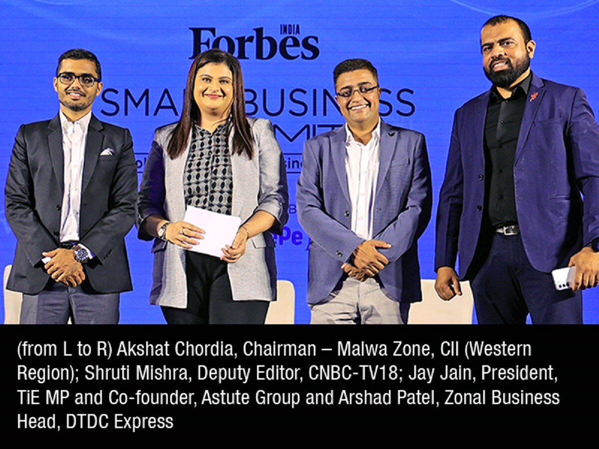 The first panel discussion, titled Delivering Big Opportunities to Small Businesses: Expanding MSME Access to Money and Markets, featured a diverse group of industry leaders, moderated by Shruti Mishra, Deputy Editor of CNBC-TV18. The panel included Akshat Chordia, Chairman of Malwa Zone (CII Western Region) Jay Jain, President of TiE MP and Co-Founder of Astute Group and Arshad Patel, Zonal Business Head of DTDC Express.