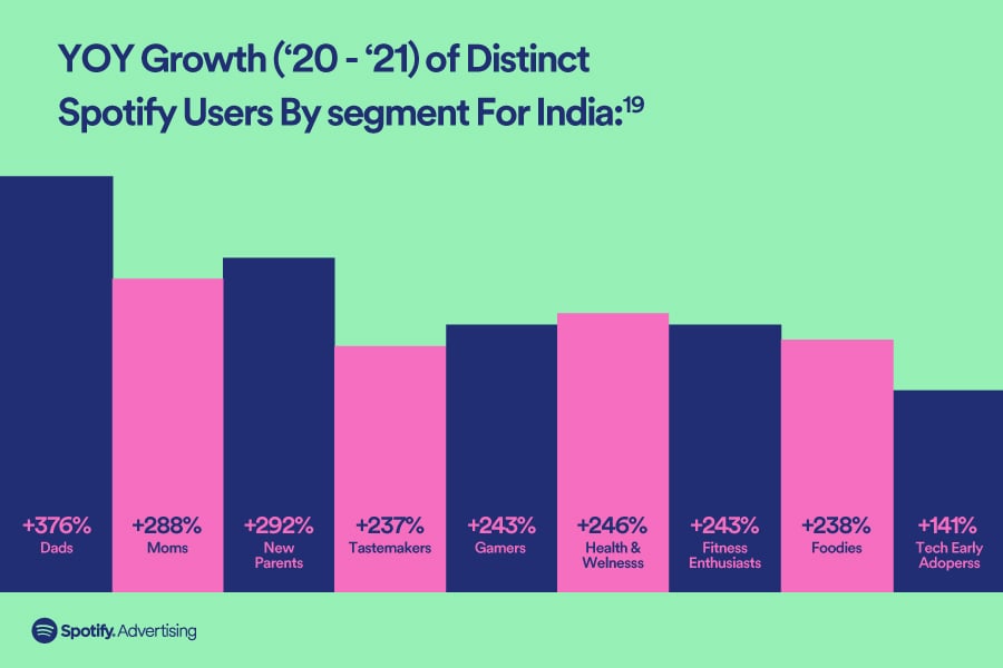 They turned to podcasts, in particular, with the number of distinct podcast users aged 15-44 on Spotify growing by +34% YoY - largely in part to an influx of audience segments like Moms, Dads, and New Parents.