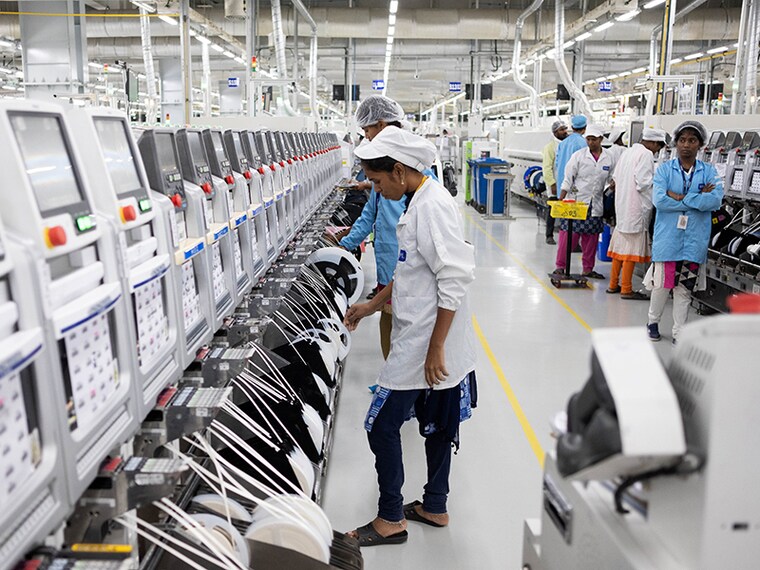Employees work on an assembly line in the mobile phone plant of Rising Stars Mobile India Pvt., a unit of Foxconn Technology Co., in Sriperumbudur, Tamil Nadu, India, on Friday, July 12, 2019.