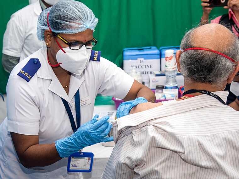 A medical worker inoculates a colleague with a Covid-19 coronavirus vaccine at the Cooper Hospital, Mumbai Image: Shutterstock