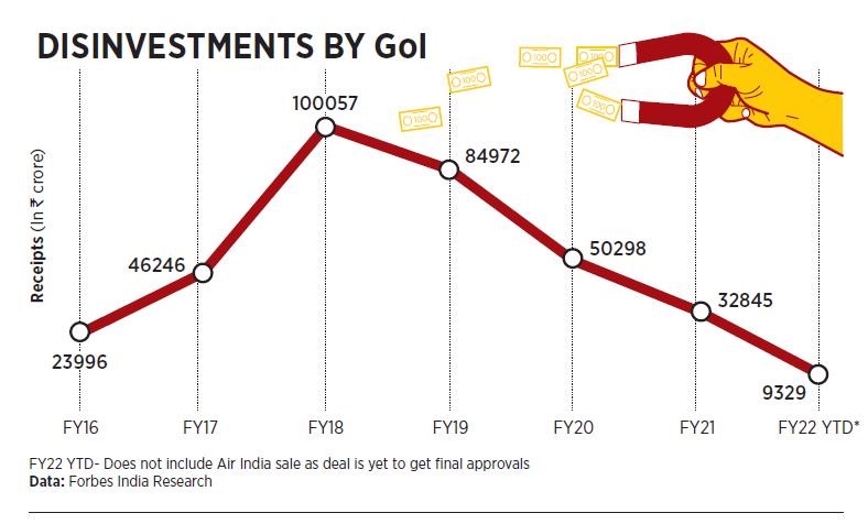 During the budget in February 2021, Finance Minister Nirmala Sitharman had set a target of ₹1.75 lakh crore for the year and was hoping to sell some of the assets that the government had put on the block in the last few years. The target was a downward revision from the ambitious target of ₹2.1 lakh crore the year before, which it could not meet. For FY21, the government managed to raise ₹32,845.18 crore.