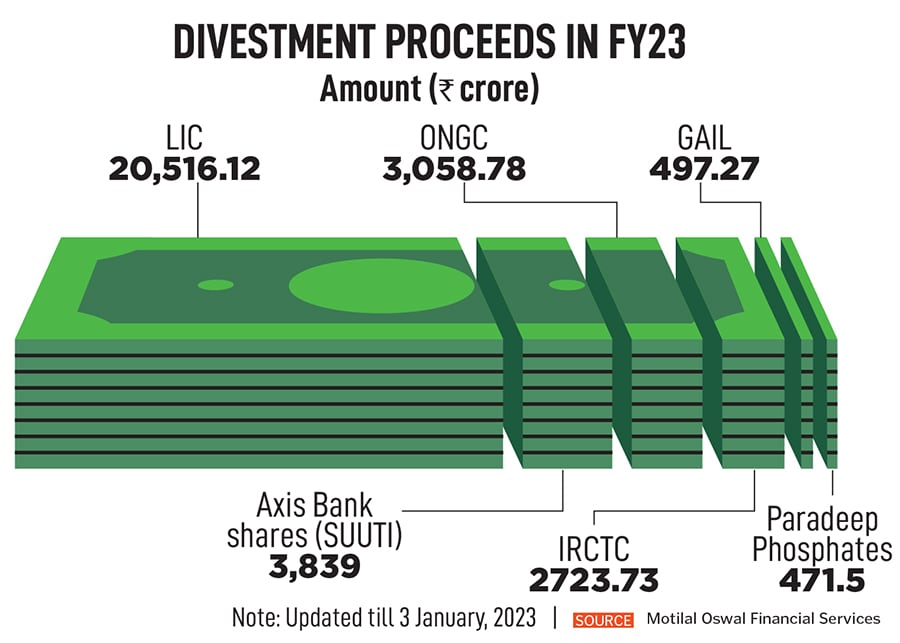 In FY23, the government has divested ₹31,106.4 crore, according to Department of Investment and Public Asset Management (Dipam) data. Of this, ₹20,516.12 crore was raised by selling its stake in Life Insurance Corporation of India (LIC) via an initial public offering (IPO). The government offloaded 3.5 percent stake in LIC.