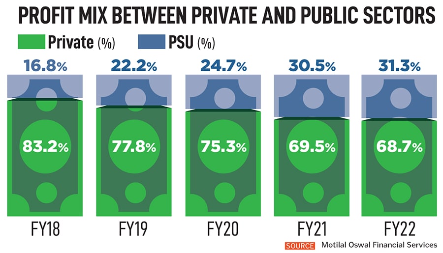 “Loss pools of PSUs have reduced consistently over the last five years. The contribution of loss-making companies has dwindled over the past few years, which is currently at 1 percent of the profit pool versus 47 percent in FY18. The share of PSUs in the profit pool expanded to 31.3 percent in FY22 after hovering in the range of 17 to 30 percent during the past few years," says Gautam Duggad, head, research, Motilal Oswal Institutional Equities.