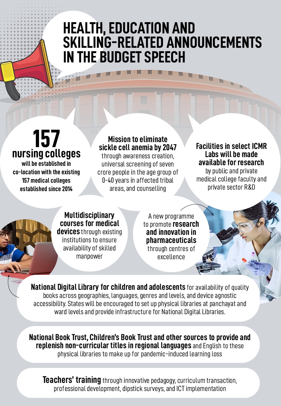 In her Union Budget speech on February 1, Finance Minister Nirmala Sitharaman announced a few provisions related to health care, education and skilling under a priority titled ‘Inclusive Development’. This included provisions targeted at skilling, research and increase in manpower, like establishment of nursing colleges, multidisciplinary courses for medical devices, national digital library for children and adolescents, and new programme to promote research and innovation in pharmaceuticals through centres of excellence (more in the box ‘Announcements’).