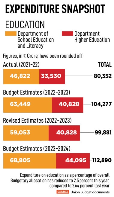 In education, the allocations have increased from Rs10,4277 crore (Budget estimates 2022-23) and Rs99,881 crore (Revised estimates 2022-23) to Rs112,890 crore this year. Expenditure on education as a percentage of overall Budgetary allocation has reduced to 2.5 percent this year, compared to 2.64 percent last year (see box).
