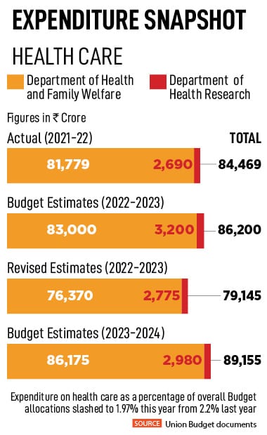 Spending towards both health and education has increased in terms of absolute numbers compared to last year, but reduced marginally as a percentage of overall Budgetary allocations. The Budget Estimates towards health care for 2022-23 stood at Rs86,200 crore for the ministry of health, which was revised to Rs79,145 crore for the same period. The estimated outlay this year is Rs89,155 crore. While health care spending occupied about 2.2 percent of the Budget last year, it reduced to 1.97 percent this year (see box).