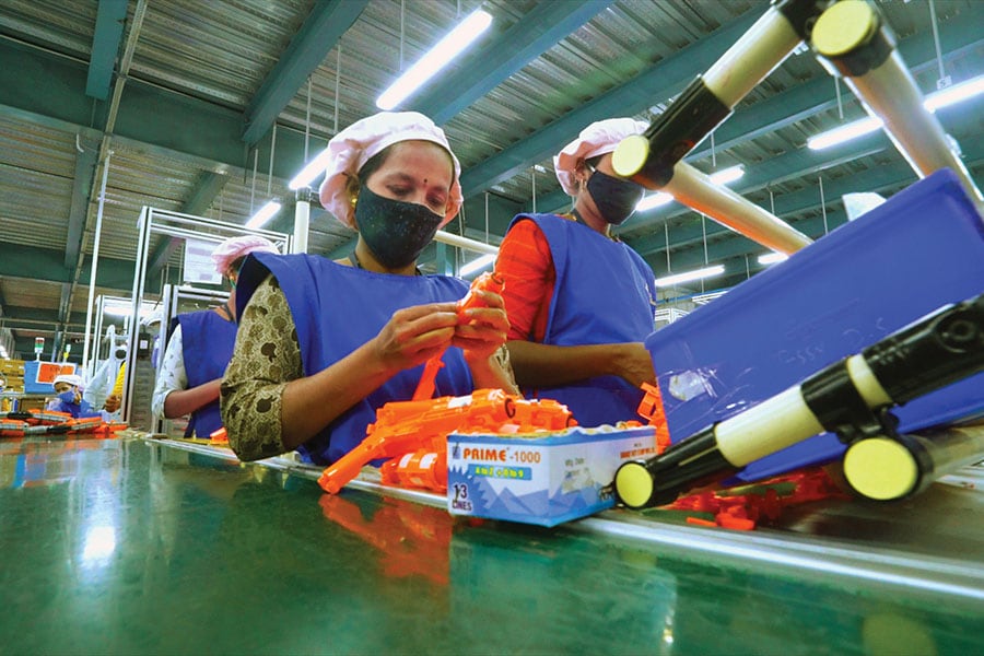 Workers put together a toy on the final assembly line at an Aequs manufacturing unit in Belagavi, Karnataka. Aequs, one of the largest toy exporters in India, has set up operations in one of the largest SEZs being set up in Koppal in the state Image: Courtesy: Aequs