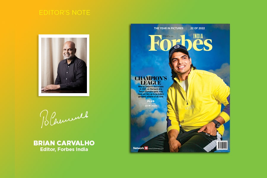 One of the brightest spots in India is the steady gains in sports, from athletics to badminton and chess. The Forbes India Cover Story is on a sportsperson who may be just a javelin’s throw away from earning the crown of India’s greatest athlete ever. Many would feel Neeraj Chopra is already there, with an Olympic gold, a silver at this year’s World Athletics Championships and a Diamond League title under his belt. At 25, though, there is much more metal to mine. As Kathakali Chanda, who met Chopra and profiled him, says, he isn’t content being a one or two-medal winner. For more on how the champion is handling celebrity status and preparing for the next big win, ‘Champion’s League’ is a must read.