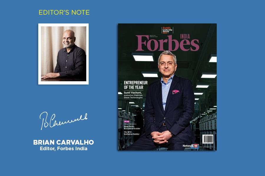 I may have refrained from naming the award winners, but business and tech trackers won’t have to cudgel their brains to figure who they are. On the cover, though, is the Forbes India Entrepreneur of the Year, Sunil Vachani, founder of what is today’s India’s largest electronics manufacturing services company. It won’t end there. As Vachani tells Naini Thaker, he wants to now make Dixon Technologies a global engineering powerhouse. For more on that ambition, go to ‘His Maker’s Voice’.