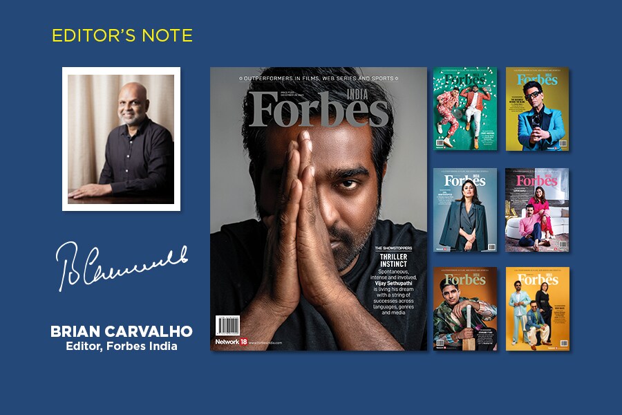 On the six covers are celebrities who shone bright through 2023. Don’t miss their vivid profiles by Team Forbes India’s bunch of evocative writers. Consider Vijay Sethupathi who, after lording over the Tamil film industry, has taken Bollywood by storm. Sethupathi tells Divya Shekhar that perhaps the secret to his success is admitting early on that he did not know anything about films or acting. “Sometimes innocence is a blessing."