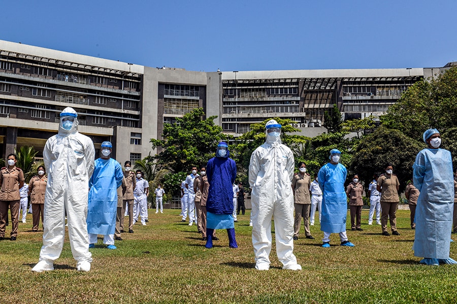 Health care workers assemble at a naval hospital in Mumbai on May 3, 2020. More than 1,000 doctors, and an untold number of medical personnel, have died after coronavirus infections, and many suffer an emotional toll as they make tough decisions about who gets treated. Image: Atul Loke/The New York Times