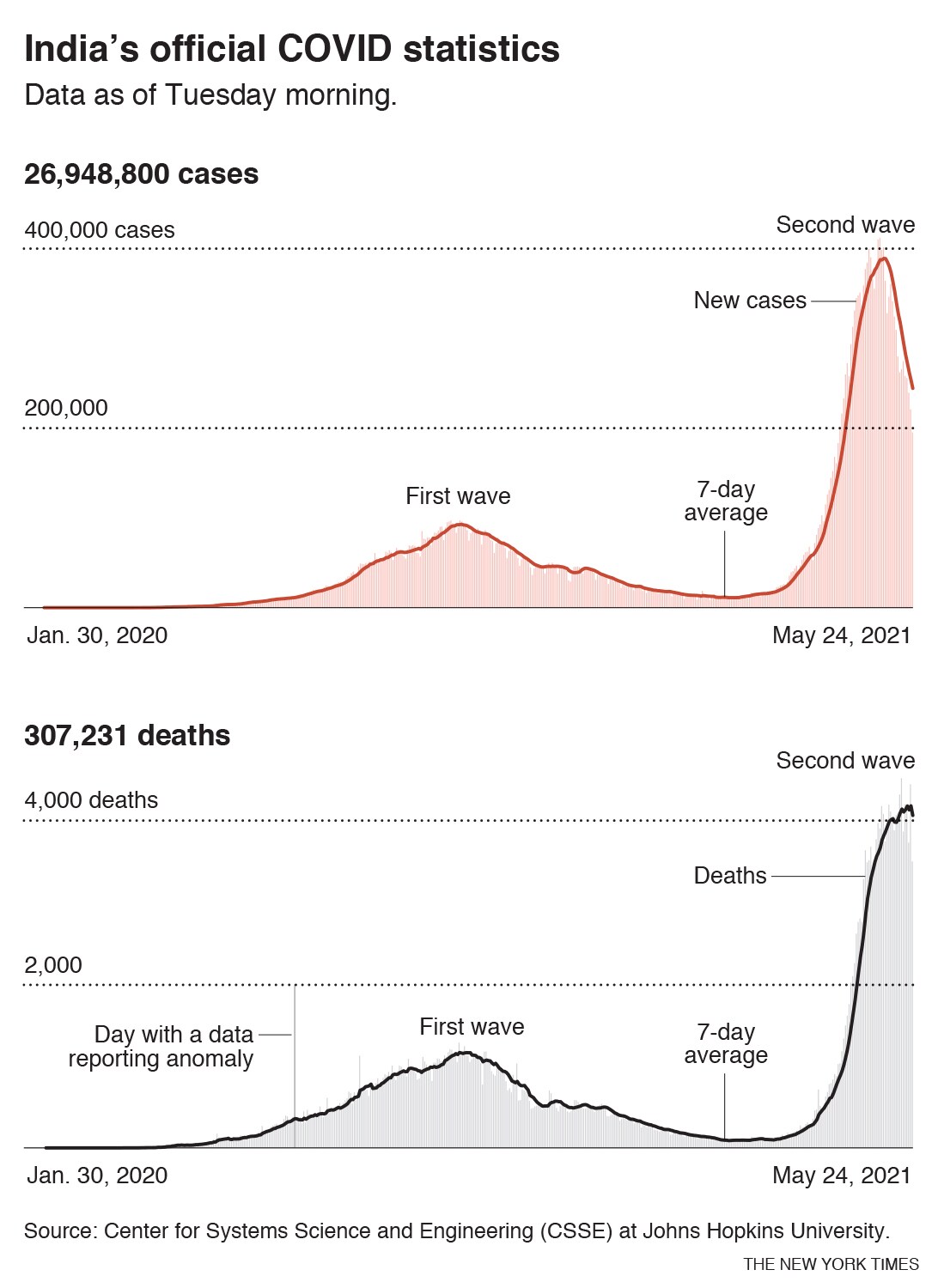 India’s official COVID statistics report 26,948,800 cases and 307,231 deaths as of Tuesday morning.