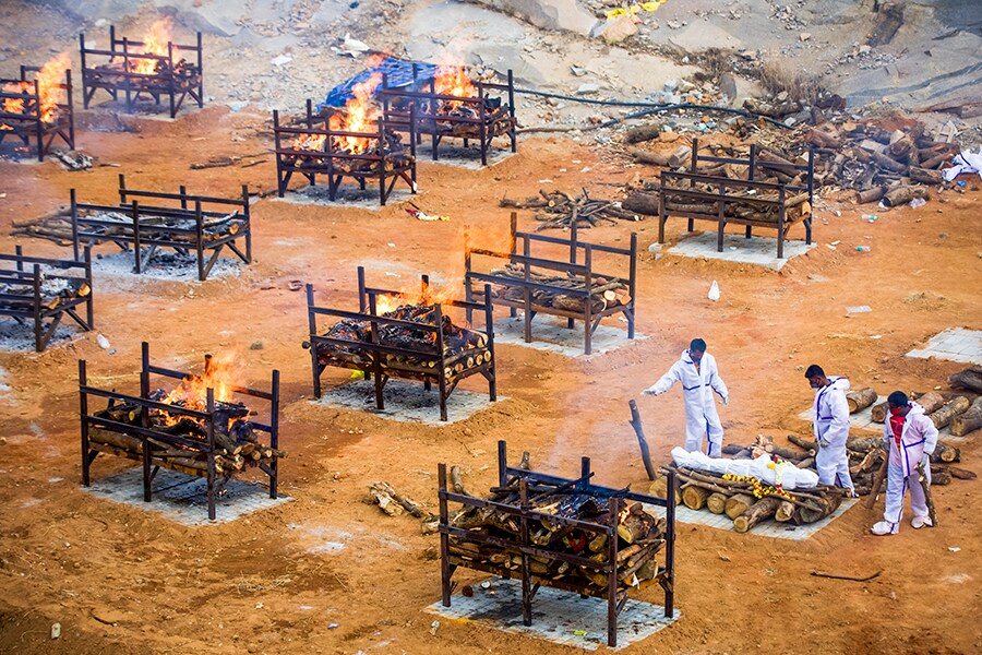 Men wearing PPE (Personal Protective Equipment) perform the last rites of a deceased relative in a disused granite quarry repurposed to cremate the dead due to COVID-19 on April 30, 2021 in Bengaluru, India. With recorded cases crossing 380,000 a day and 3000 deaths in the last 24 hours, India has more than 2 million active cases of COVID-19, the second-highest number in the world after the U.S. A new wave of the pandemic has totally overwhelmed the country"s healthcare services and has caused crematoriums to operate day and night as the number of victims continues to spiral out of control.