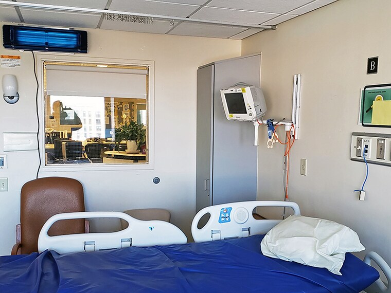 A photo provided by UVResources shows a patient room with an ultraviolet light, upper left, installed to zap pathogens, called upper-room ultraviolet germicidal irradiation. Some researchers hope the decades-old technology might get its moment and be deployed in stores, restaurants and schools.