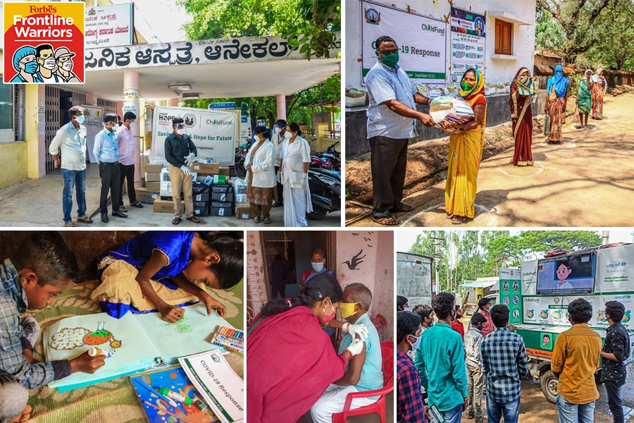 Clockwise from above: A primary health center in Bengaluru receives medical equipment from ChildFund India Food and hygiene kits were provided to the locals in Jagdalpur, Chattisgarh, April 2020 The project undertook mobile campaigns on vaccination in coordination with the government, demonstrating various social and behavioural change activities, Chittoor district A frontline worker vaccinating a villager in ChildFund India’s project village in Nuapada district, Odisha. Children engaged in art activity conducted by ChildFund India amid the pandemic[br]