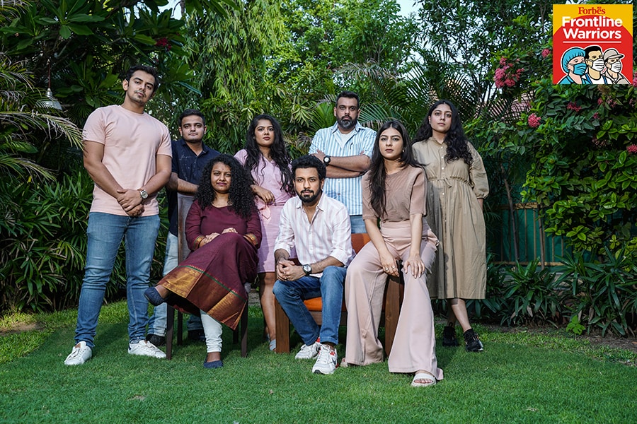 Covid-19 Warriors Team Sahaay (From left) Devarshi Shah, Karan Ghoda, Zeal Shah, Shaili Shah, Mitra Gadhvi, Rohan Bhatt, Saloni Mehta and Shirali Shah Image: Ved Dave[br]