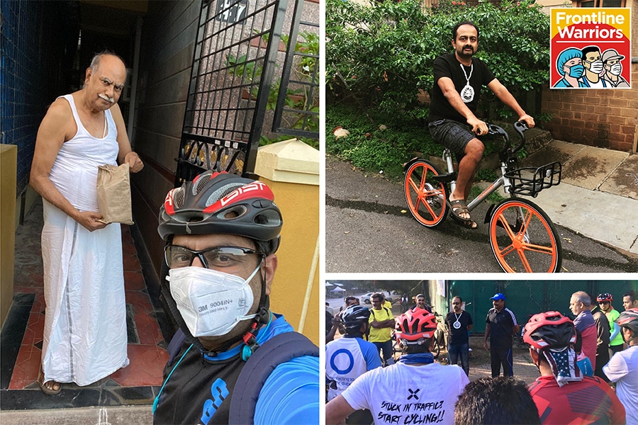 Relief Riders, a group of cycling enthusiasts led by Sathya Sankaran (top right), delivers groceries and medicines for the elderly or families that are stuck at home with Covid-19