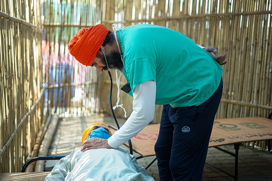 “I used to get a lot of calls for help from the protest sites. Sitting in the US, I couldn’t do much. The way things were shaping up, I knew I would have to come to India as none of the neighbouring cities were providing any medical assistance to the farmers," says Singh, who is also the founder and president of the NGO 5 Rivers Heart Association that operates in the USA, India and Ghana. The NGO has been working at the Delhi borders since November 2020, when the farmers’ protests first started, and Singh came down to visit the Tikri border in the first week of December. He thought he would oversee and streamline the work of the NGO and go back, but seeing the situation on the ground he quit his fellowship at Robert Wood Johnson University Hospital in Newark, New Jersey, and stayed. He and his team have since set up medical camps and makeshift hospitals, and provide medicines and consultation to protesters, policemen, CRPF personnel and visitors for free.