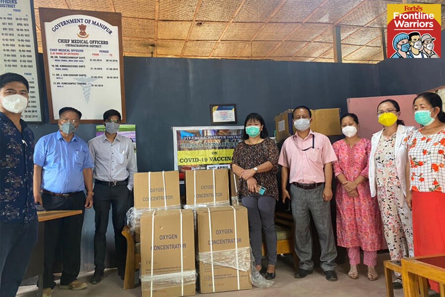 Ten oxygen concentrators and 3BiPAP machines being handed over to Dr Vumchinpau Tonsing (second from left), the chief medical officer of Manipur"s Churachandpur district, with the support of Rahul Pandey (third from left), the additional district collector